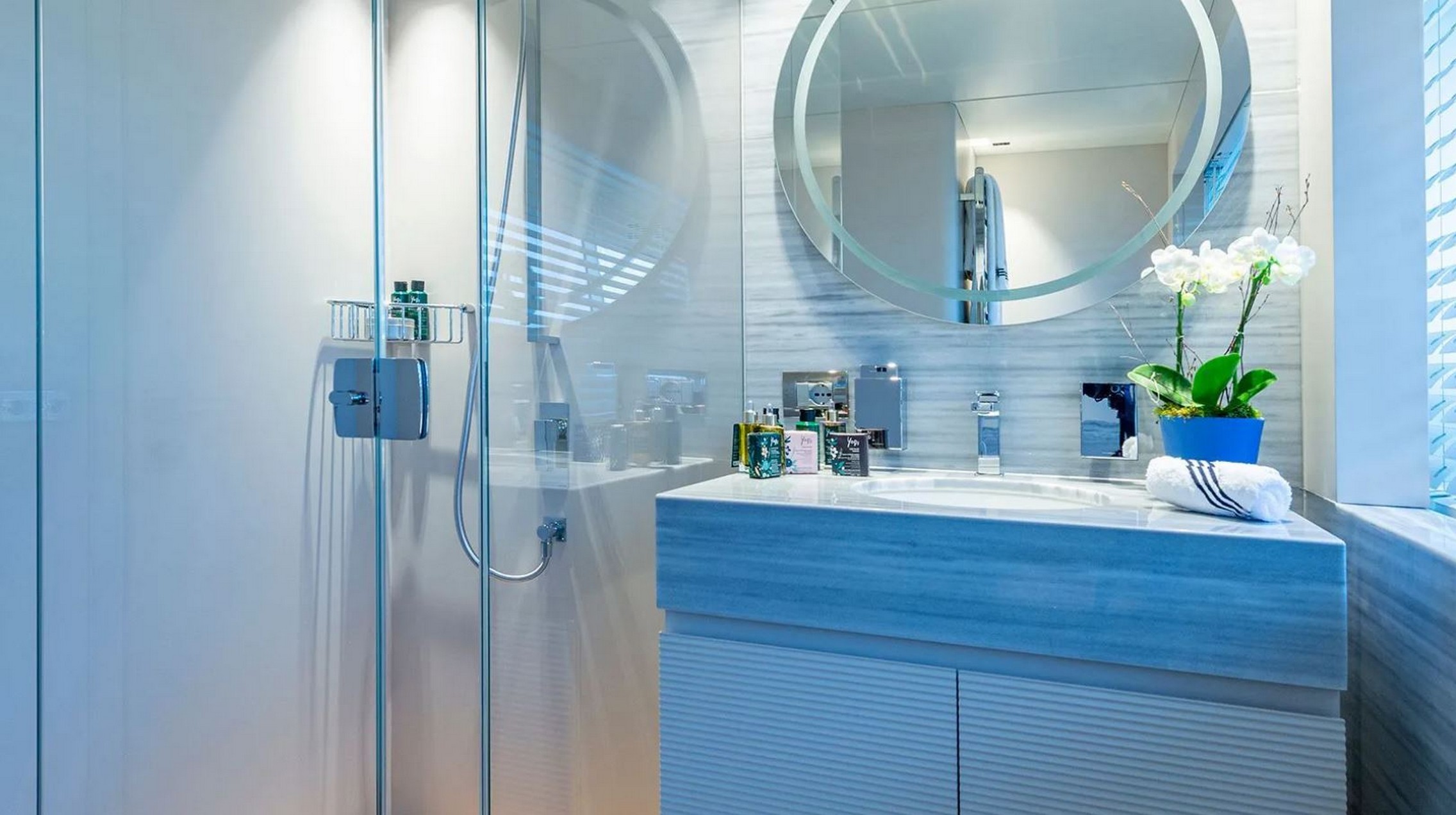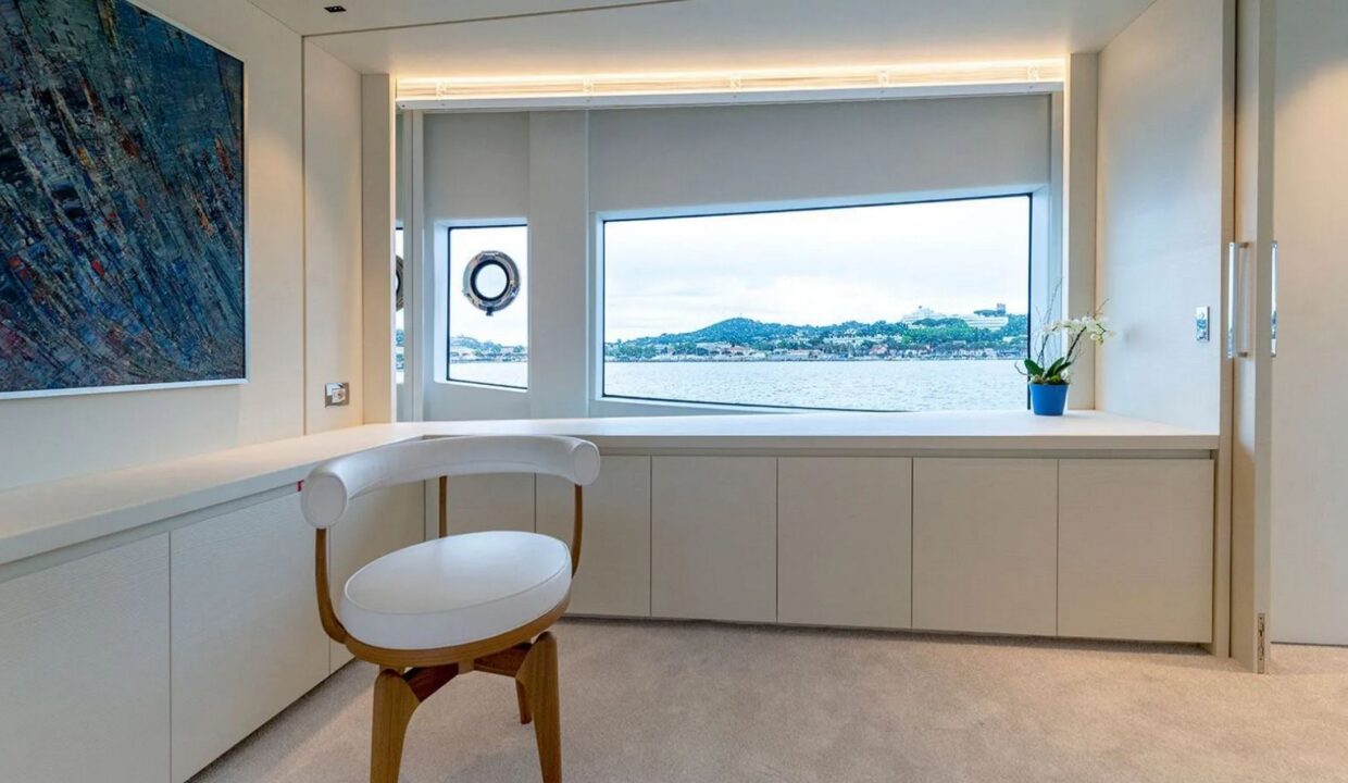 Wellness and sustainability are central features throughout the yacht, highlighted by the yacht’s natural ventilation system that uses sea air current to reduce the need for air conditioning. On board eco-friendly measures also include the use of recyclable glass and metal to reduce the use of composites, as well as sustainably sourced products. The yacht also enjoys low fuel consumption, even when travelling at speeds of around 28 knots.