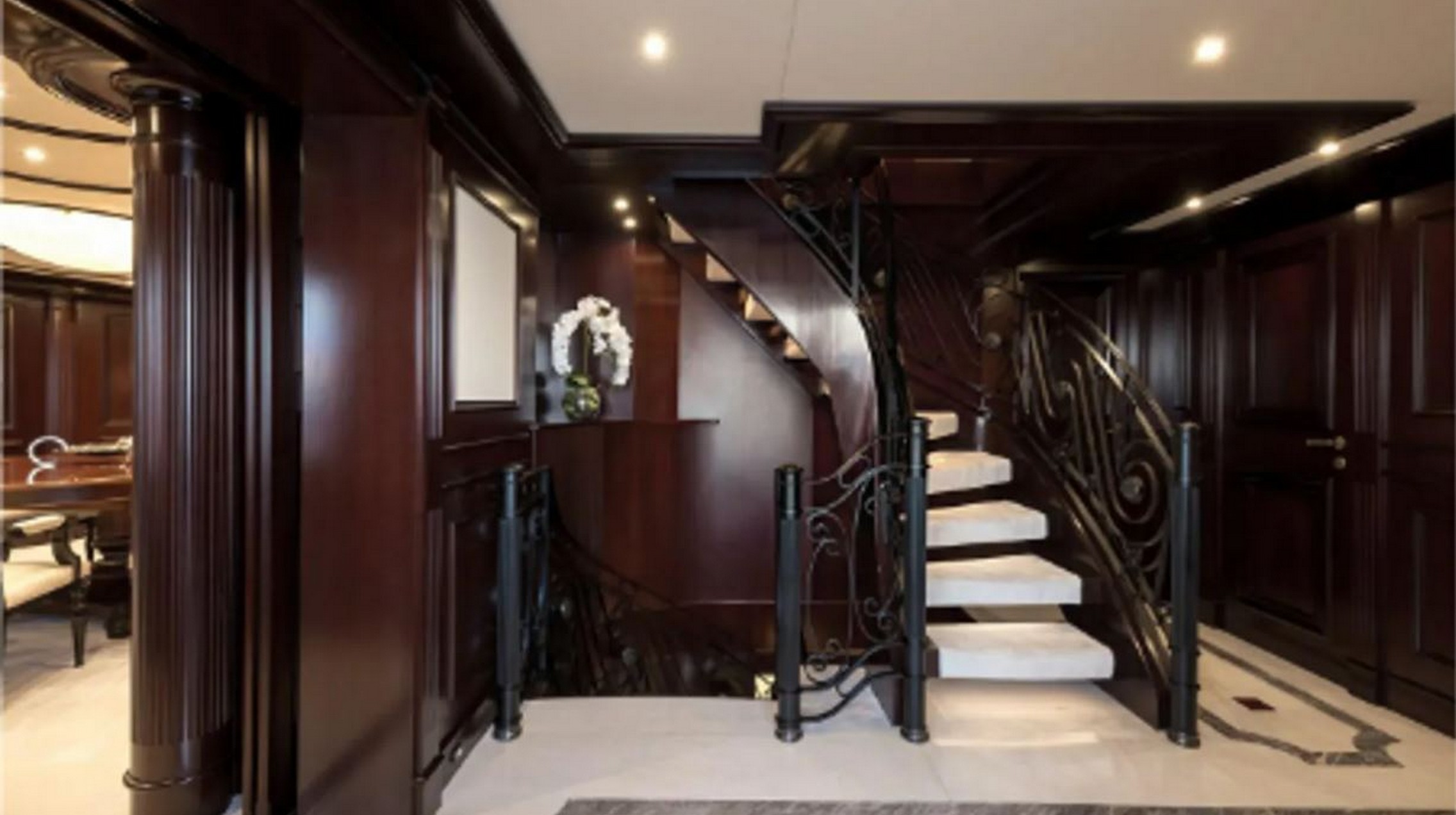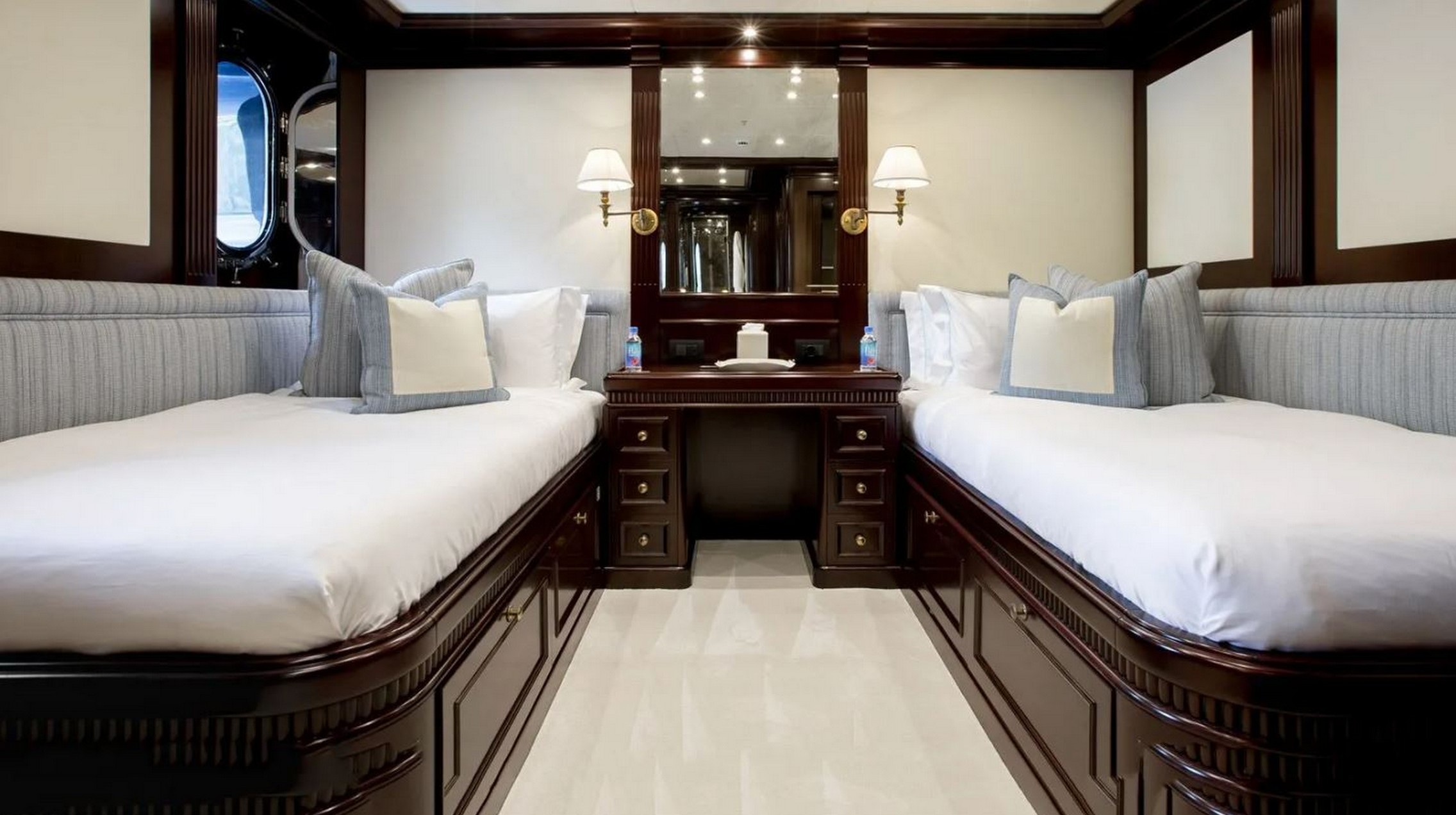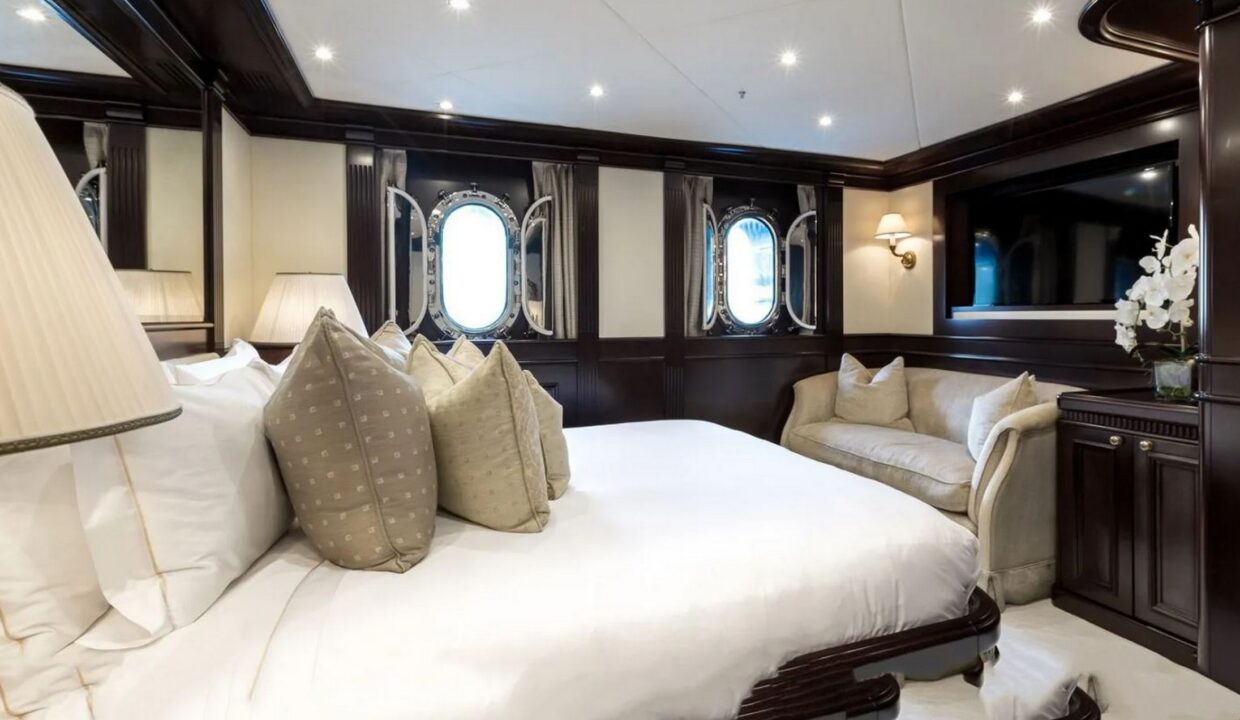 All guest cabins are spacious and light – the perfect retreat at the end of a busy day on the water! The full beam main deck King master cabin is an especially impressive space, with his and hers bathroom, a large dressing room and an adjoining study. Other accommodation options include a double on the upper deck plus two VIPs, a double and a twin on the lower deck. All guest cabins are ensuite, and the master and VIPs both have Jacuzzi tubs, and modern AV systems are installed in every cabin. An elegant stairwell connects the main and lower deck for easy movement around the yacht.