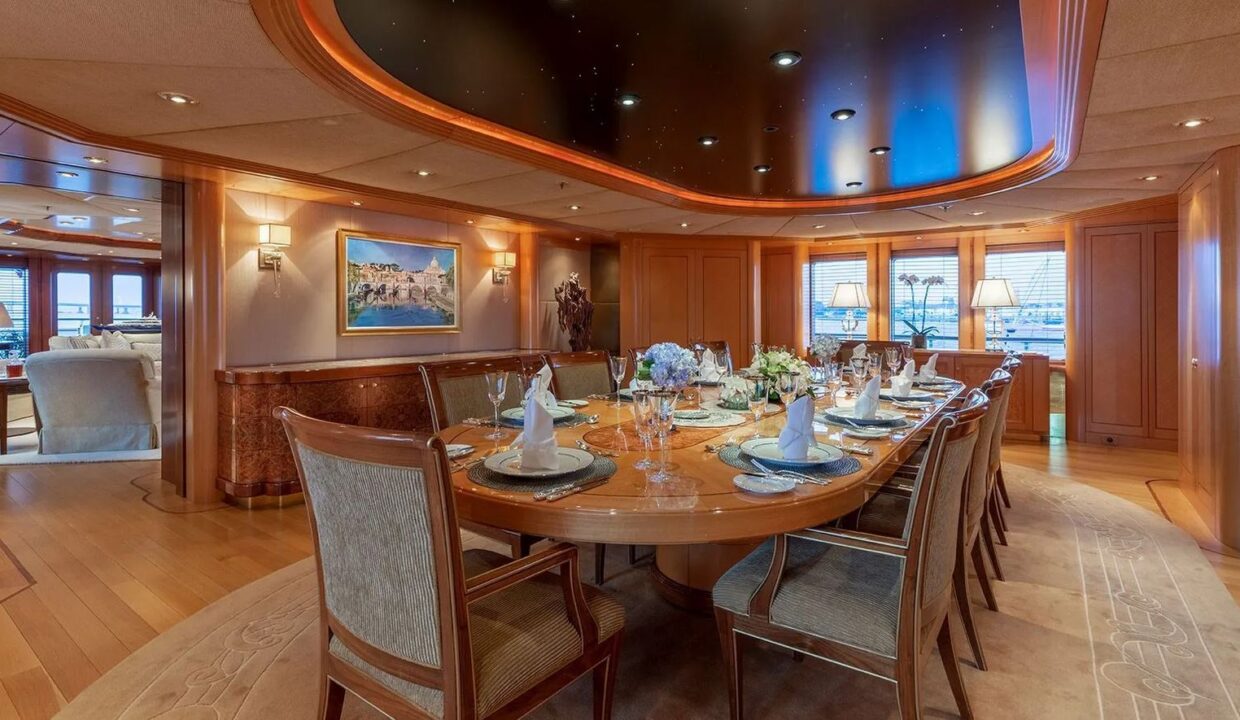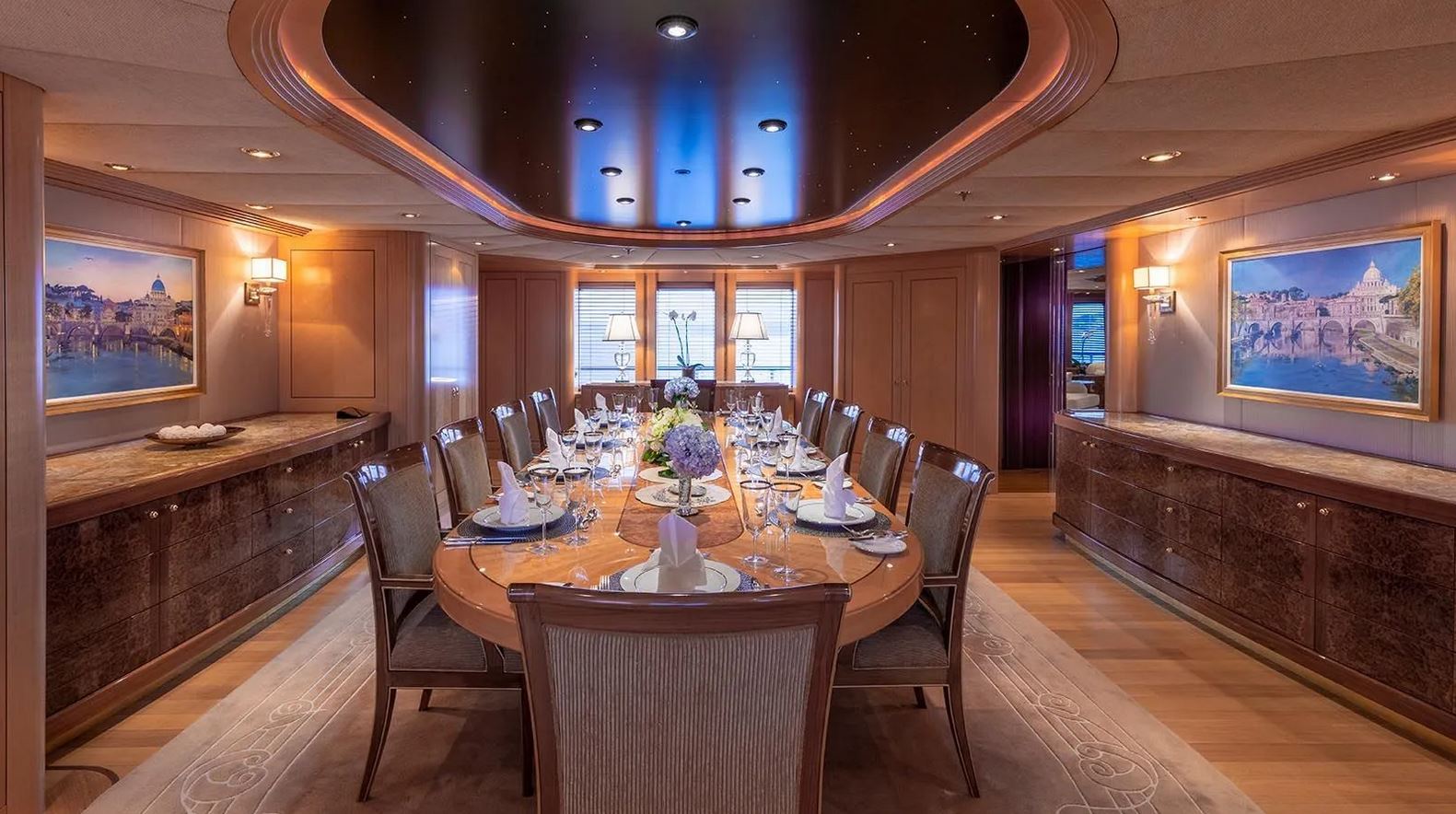 Elevator access between all guest decks makes easy to move around and with large spaces throughout the yacht there are certainly plenty of spots to enjoy! The main saloon is a social space, perfect for entertaining, with a décor that features hardwood floors, an earthy-toned palette and stunning artwork. This versatile space, with inviting sofas and an entertainment system includes a television hidden behind artwork. A separate dining space for up to 16 guests ensures a formal private space for hosting special meals and enjoying a menu crafted by the yacht’s talented chef. A starlight ceiling sits above the table, creating a special atmosphere.