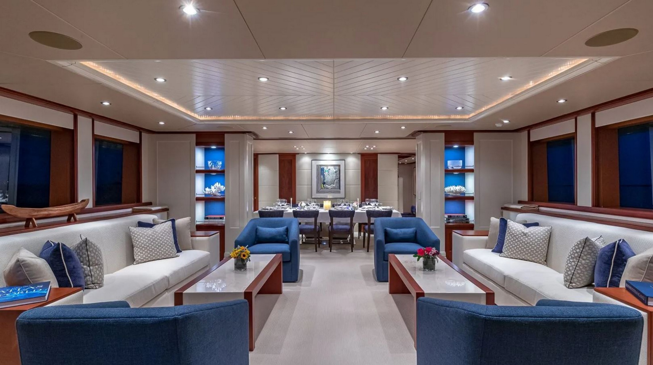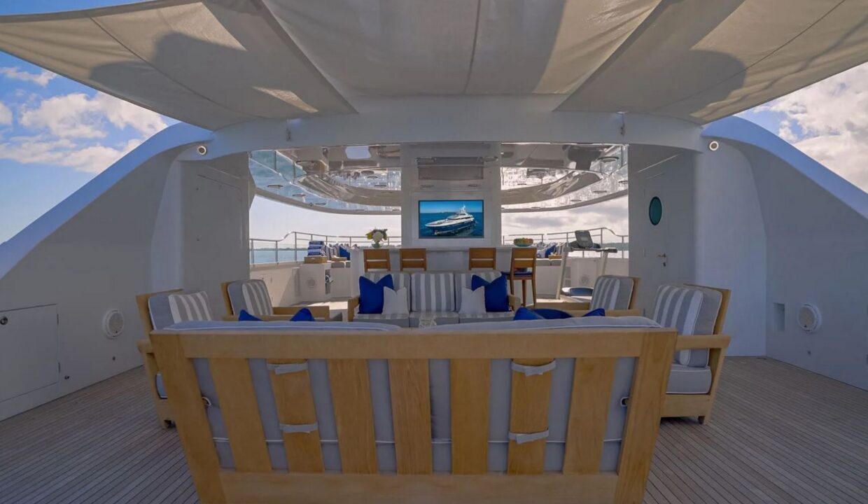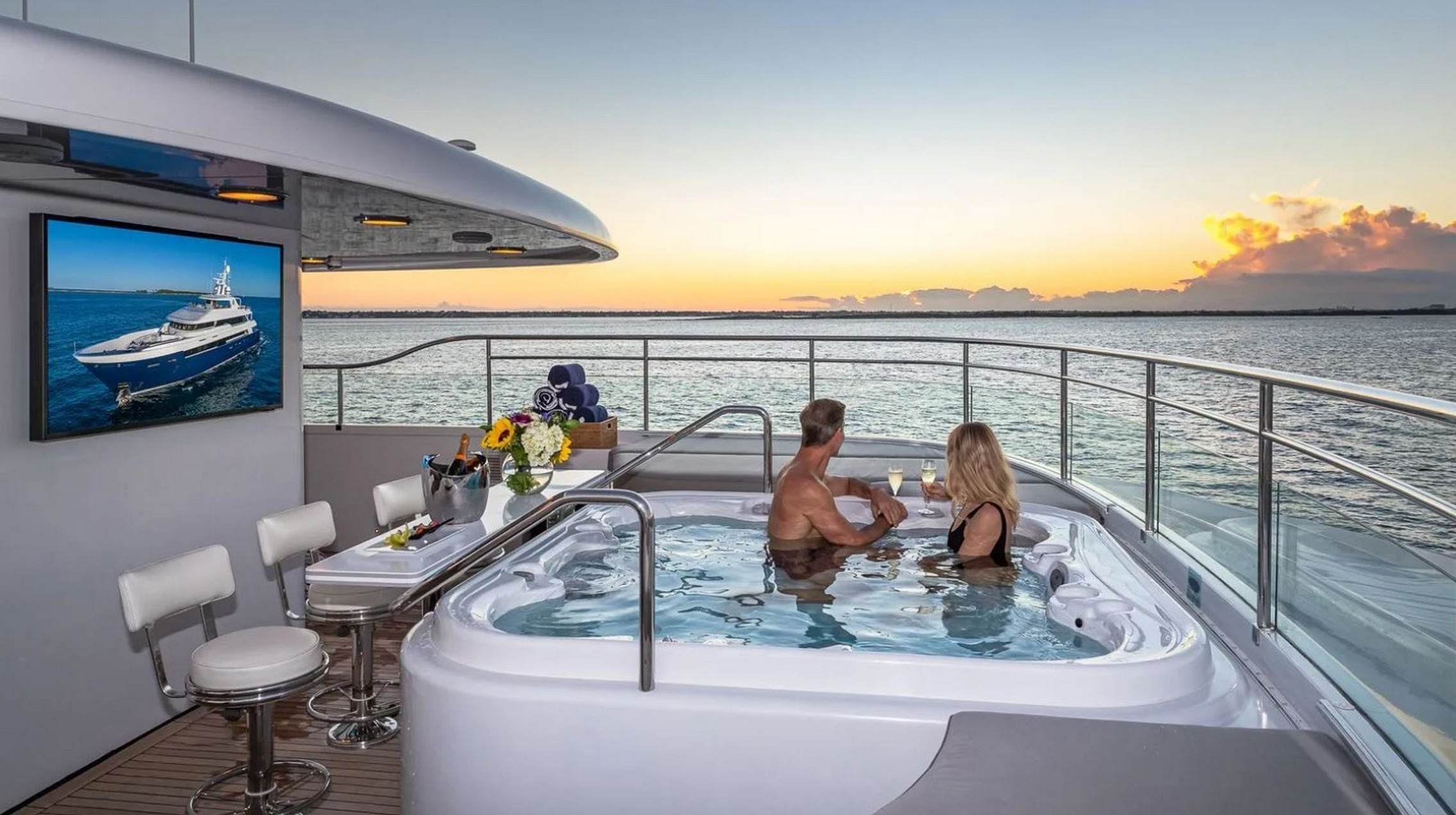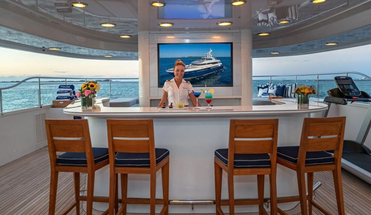 Under the direction of her new owners and the renowned designers, Bonville Associates, the yacht completed an extensive interior and exterior refit in 2021. Her interior refresh takes full advantage of the yacht’s large main salon windows that provide an abundance of natural light and includes new wall coverings and carpeting throughout, eleven HD TVs for guests to enjoy their favorite shows and movies, a new SONOS sound system allowing guests to play their own music selections, and upgraded high speed internet and WIFI services to insure maximum connectivity. The yacht is also fitted with the most advanced UV air purification system available and an upgraded air ventilation system, making its environment the safest possible. The boat’s elevator ascends to all four decks providing exceptional accessibility and the entire yacht enjoys a child-safe environment, with gates and sea nets available, as needed.
