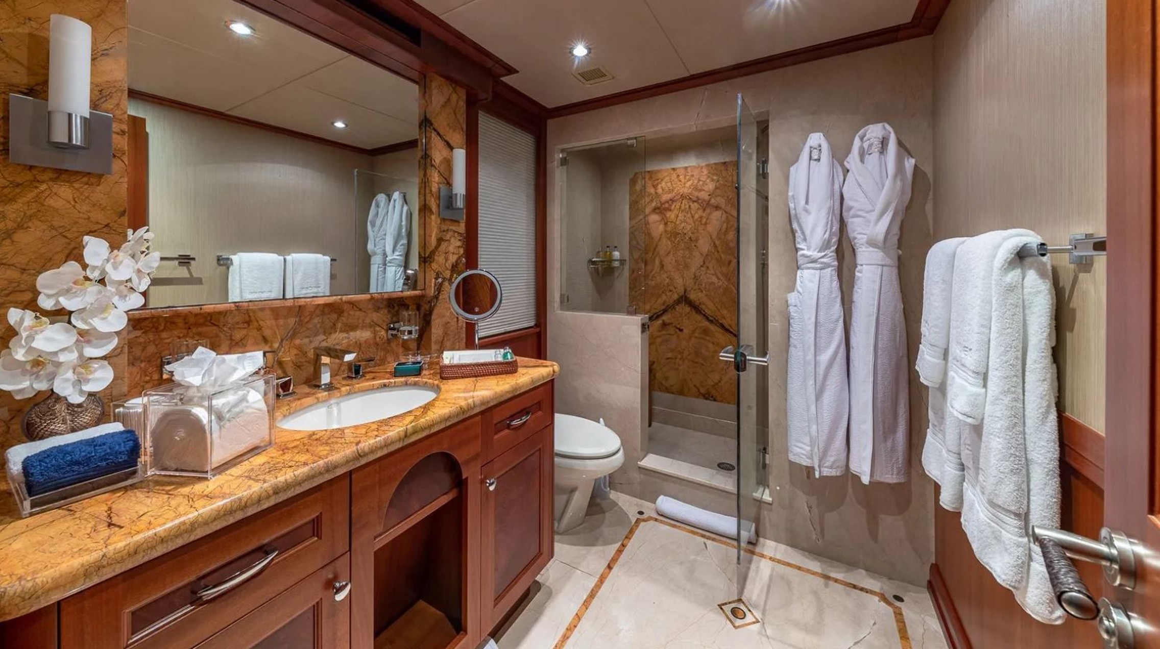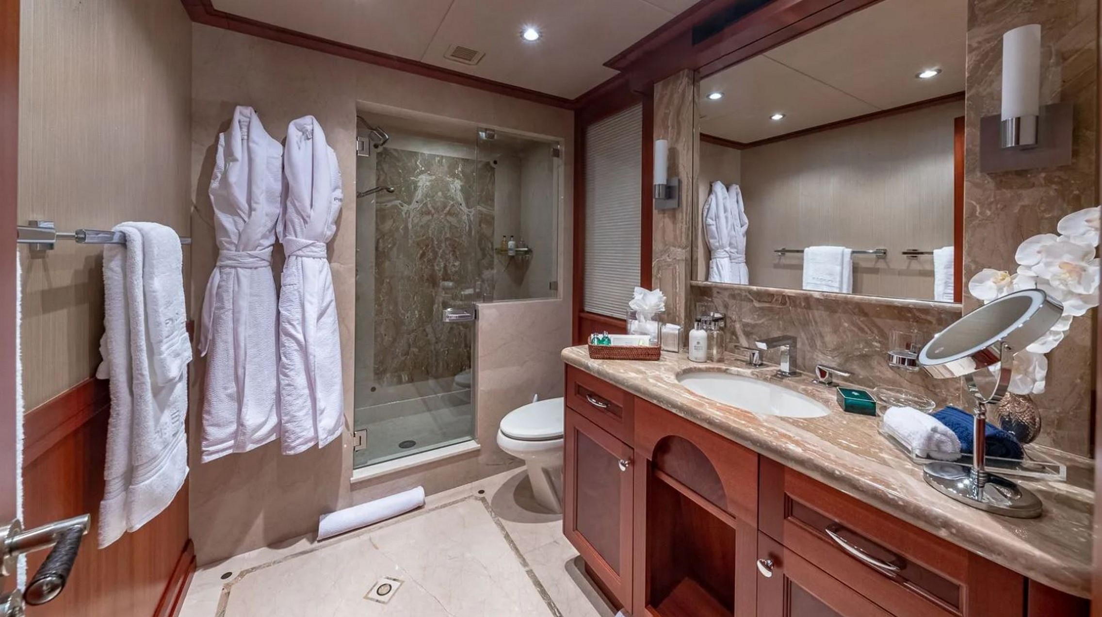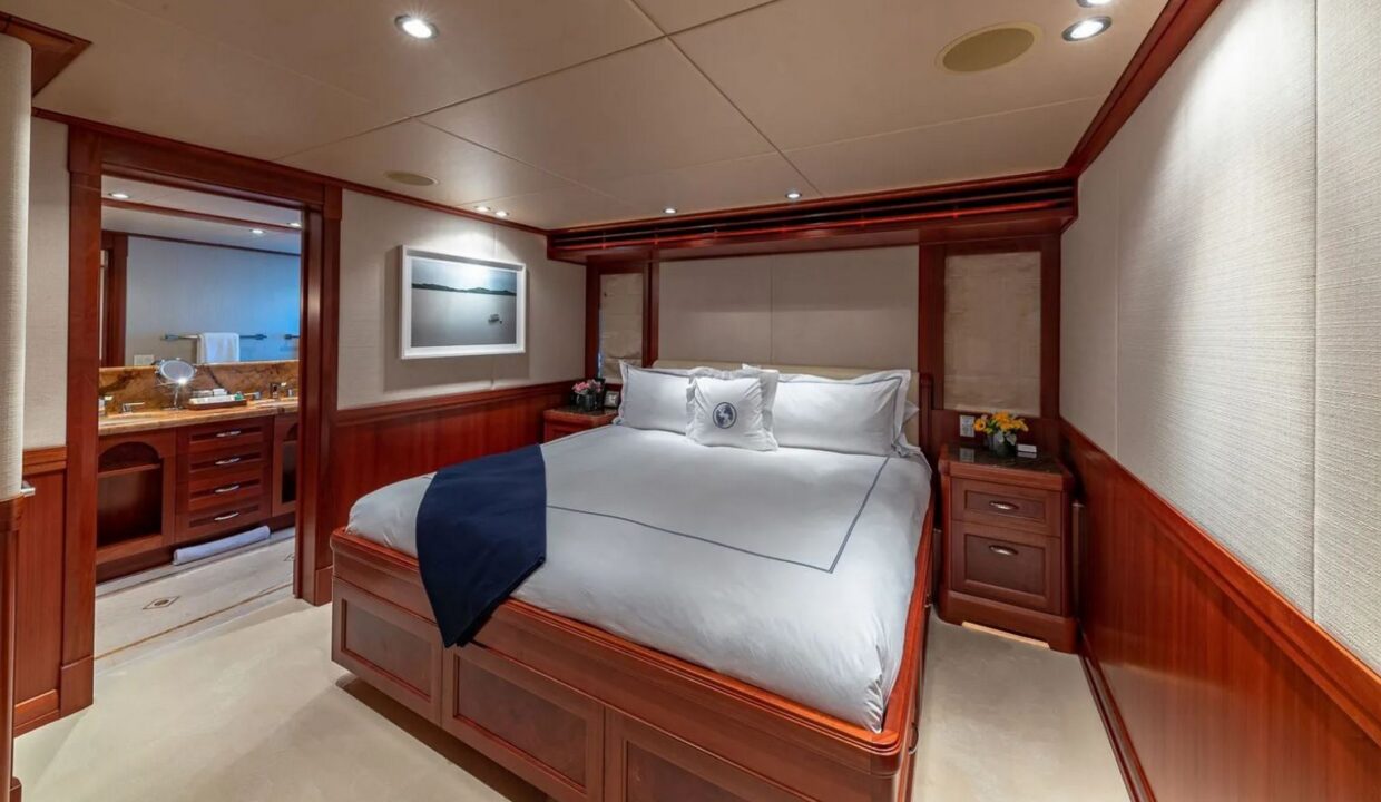 Under the direction of her new owners and the renowned designers, Bonville Associates, the yacht completed an extensive interior and exterior refit in 2021. Her interior refresh takes full advantage of the yacht’s large main salon windows that provide an abundance of natural light and includes new wall coverings and carpeting throughout, eleven HD TVs for guests to enjoy their favorite shows and movies, a new SONOS sound system allowing guests to play their own music selections, and upgraded high speed internet and WIFI services to insure maximum connectivity. The yacht is also fitted with the most advanced UV air purification system available and an upgraded air ventilation system, making its environment the safest possible. The boat’s elevator ascends to all four decks providing exceptional accessibility and the entire yacht enjoys a child-safe environment, with gates and sea nets available, as needed.