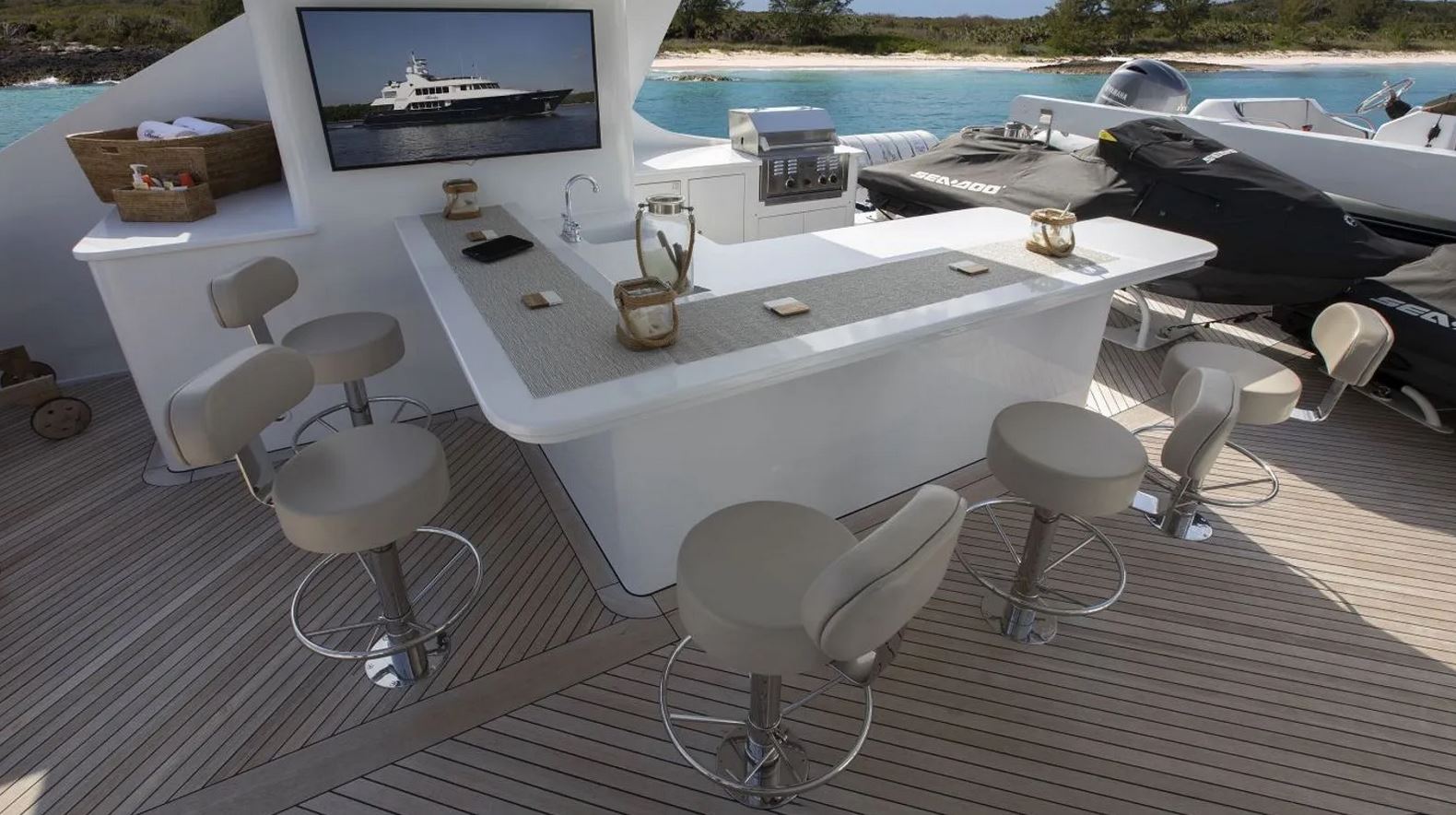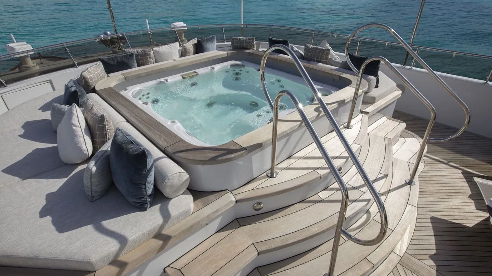 A classic tri-deck motor yacht by Trinity, offers a warm and welcoming interior with a contemporary touch. The yacht is perfect for socializing and relaxation, boasting vast deck spaces and a cozy sky lounge with large windows to take in the breathtaking views. The main salon offers a neutral palette of whites, beiges, and blues, complemented by African cherry wood paneling. The bridge deck aft provides alfresco dining for up to 10 guests. Guests can also enjoy the swim platform and easy access to the water. The best spot on board is the sundeck, featuring a large Jacuzzi, sun pads, and optional shading. The yacht can comfortably accommodate ten guests across five cabins. The on-deck Master suite is full-beam and exquisitely appointed, featuring ample storage, an office area, his-and-hers wardrobes and bathrooms, a vanity area, a walk-in shower, and a Jacuzzi tub. The yacht is an ideal choice for families or groups of friends looking for a charter to remember.